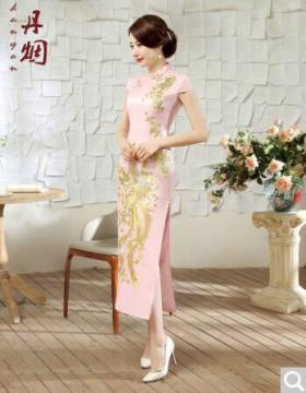 丹烟 新款丝绸长旗袍女装立领气质修身改良礼服刺绣包臀连衣裙 C0041-B粉色
