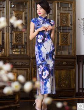 丹烟 新款女装中式立领弹力修身长旗袍改良晚宴气质礼服连衣裙 如图色