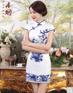 丹烟 新款女装中式立领青花瓷修身短旗袍裙夏装复古短袖连衣裙 白色